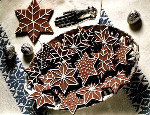 Затем получившейся глазурью наполняем кондитерский мешок и рисуем на печенье звезды, используя для этого тонкую насадку. Глазурь по консистенции не должна быть слишком твердой, так как в таком случае не закрепится на печенье, а также не должна быть жидкой, чтобы не растечься. Затем проводим от центра к концам звезды линии, чтобы получилась снежинка. После того, как нанесли глазурь, печенье помещаем в герметичную емкость. Новогоднее печенье готово!