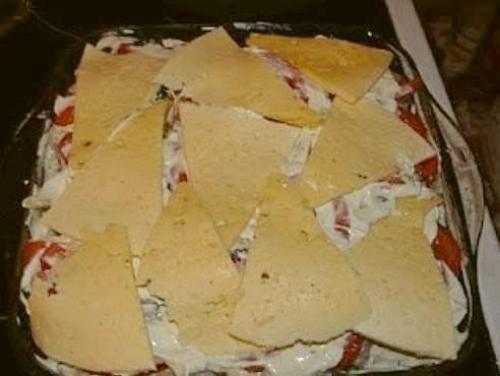 3. слегка присаливем, посыпаем зеленью и хорошо смазываем сливками (или поливаем - все зависит от жирности сливок. Затем помидоры - тоже смазываем сливками. Последний слой - сыр! Выкладываем пластиночки сыра так, чтобы они покрыли практически всю поверхность. Остатки сливок аккуратненько выливаем по краям.