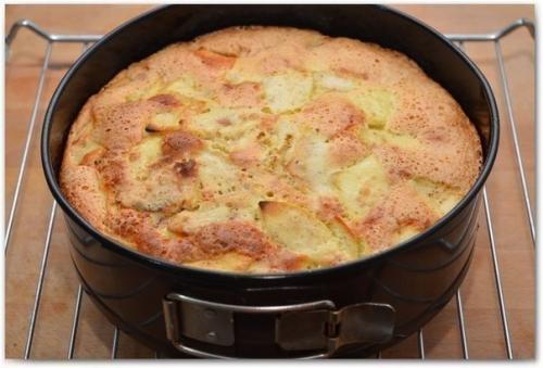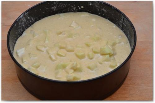 3. разъемную форму сбрызгиваем растительным маслом и мукой. Форма 22 см в диаметре, 6 см высота. На дно формы выкладываем яблоки и заливаем получившимся тестом. Тесто должно полностью фрукты покрыть.