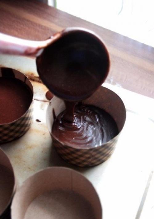 3. тесто разлейте по формочкам, заполняя на 2/3 объема. Выпекайте около 25 минут так, чтобы при касании верхушки капкейков слегка колыхались. Остудите.
