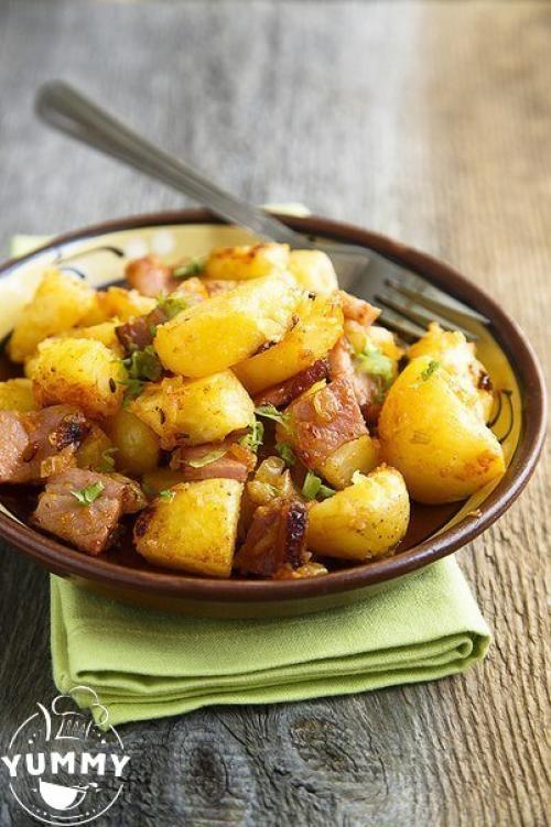 3. на сковороду выложить картофель, обжарить до золотистого цвета. Добавить тмин и паприку, перемешать. Готовить еще минуту - другую. В сковороду лук и бекон вернуть. Перемешать. Посолить и поперчить. Посыпать петрушкой и подавать. Приятного аппетита!