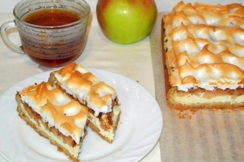 . Пирог представляет собой удачное сочетание рассыпчатого песочного теста, мягкого нежного ванильного творога, сладких яблок с коричной ноткой и верхнего слоя безе.