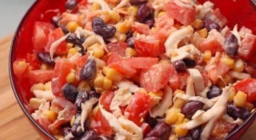 Китайский салат тонко нарежьте. Помидоры кубиками нарежьте. Добавьте фасоль и кукурузу, предварительно слив сок из банок. Добавьте мелко нарезанный чеснок, кетчуп и майонез (лучше домашний. Посолите по вкусу. Хорошо перемешайте и подавайте приятного аппетита!