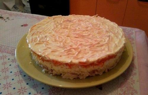 5. корейская морковь (отжать сок), сверху покрывается обильно майонезом.