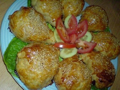 - Окорочка куриные (нижняя часть) 8 шт., - сыр плавл. Для тоста 4 шт., - чернослив 8 шт., - коньяк 2-4 ст. л., - грецкие орехи 8 половинок, - яйцо, - соль, перец, - чеснок, - слоёное тесто 400 гр., - кунжут 1-2 ст. л.