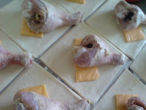 4. в окорочек возле косточки заталкала чернослив, вымоченный в коньяке (полчаса), и полорешка грецкого, 5. завернула в тесто и выложила на противень, 6. покрытый пергаментом.