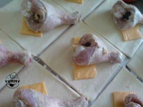 - Окорочка куриные (нижняя часть) 8 шт., - сыр плавл. Для тоста 4 шт., - чернослив 8 шт., - коньяк 2-4 ст. л., - грецкие орехи 8 половинок, - яйцо, - соль, перец, - чеснок, - слоёное тесто 400 гр., - кунжут 1-2 ст. л.