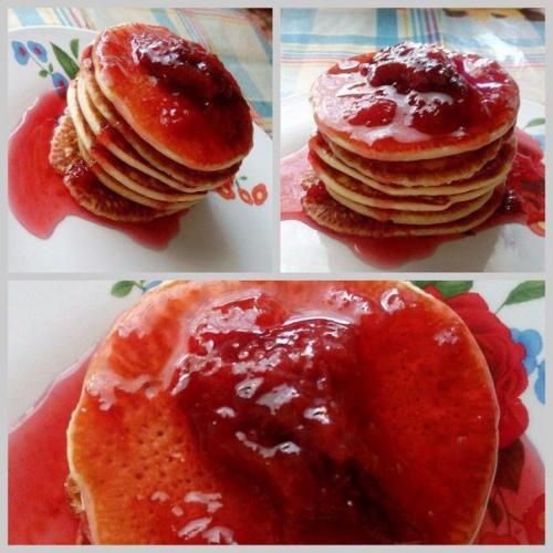 . Дайте тесту постоять 5-6 мин и можете выпекать оладьи на раскаленной сковороде, немного смазанной маслом, под крышкой на медленном огне по 3-4 мин с каждой стороны. В конце сложите оладьи стопкой и полейте джемом. Приятного аппетита!