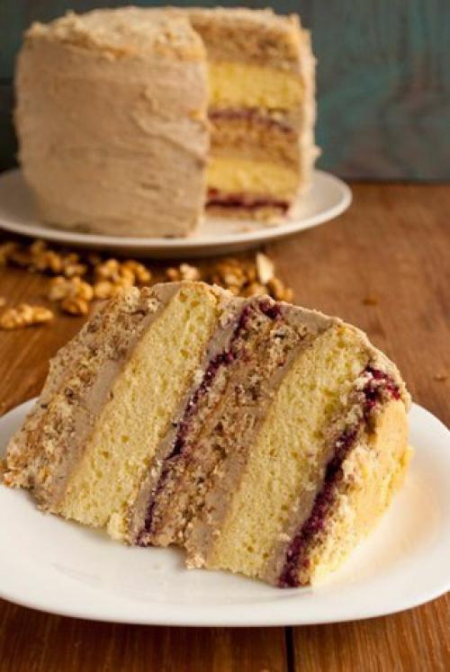 5. сборка торта - ореховый корж, вишневое варенье (2 ст. л), крема с халвой, бисквитный корж, крема с халвой, ореховый корж, орехового крема, ореховый корж, вишневое варенье (2 ст. л), крема с халвой, бисквитный корж, крема с халвой, ореховый корж.