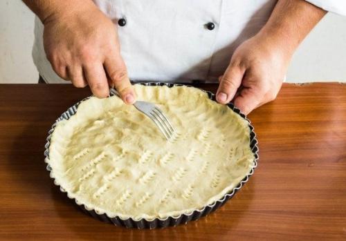 2. раскатайте тесто на столе, присыпанном мукой, в ровный пласт. Переложите его в жаропрочную форму диаметром 24 см. Сформируйте бортики высотой 2 см, излишки обрежьте. Проколы вилкой сделайте. Уберите в холодильник на 15-20 минут.