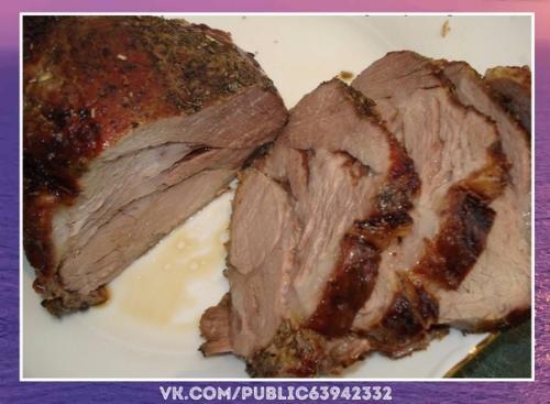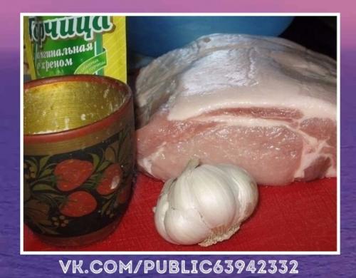 Рецепт настолько простой и настолько вкусным получается мясо, что я даже жалею, что не узнала его раньше. Итак, мясо немного споласкиваем, мы вытираем насухо полотенцем. Солим, перчим по вкусу. Шпигуем в разных местах чесноком. Намазываем горчицей и оставляем на несколько часов в холодном месте.