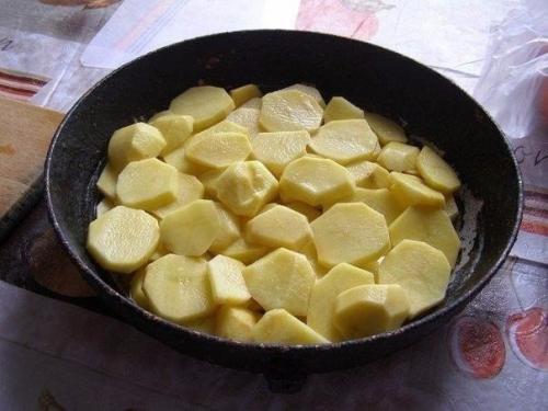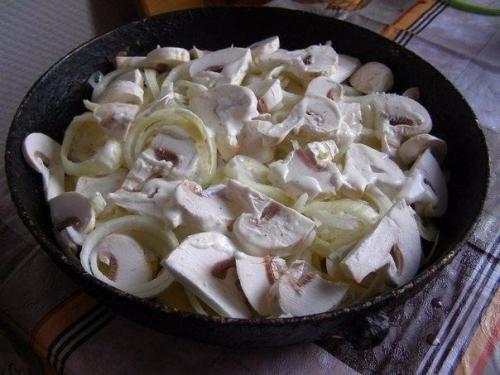 Мы нарезаем картофель, лук, грибы, помидор. Выкладываем слоями на сковороду, поливаем соусом и посыпаем сыром, выпекаем при температуре 180 гр. 40 мин. Приятного аппетита!