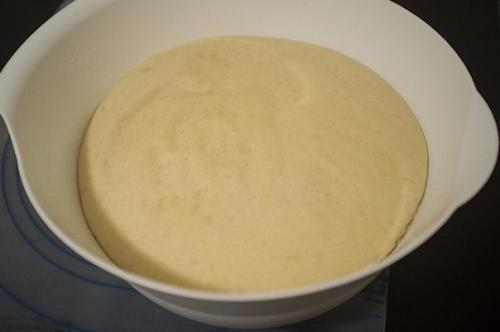 В глубокую форму просеять муку с солью. Добавить яйцо и масло, перемешать слегка и ввести молоко с дрожжами. Замесить тесто и вымешивать его до гладкого состояния примерно 5-6 минут (оно уже должно почти не прилипать к рукам.