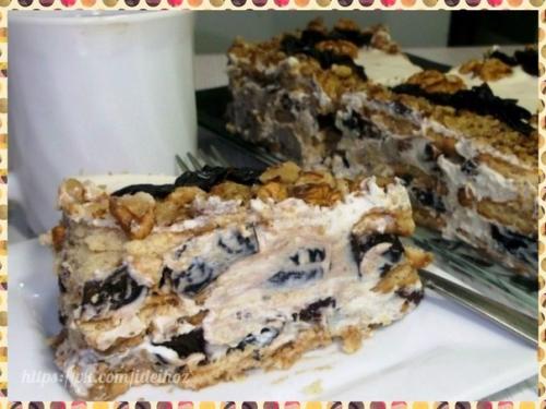 2. поверх крема кладем слой дробленых грецких орехов. Чернослив заранее промываем горячей водой и слегка обсушиваем. Нарезаем его мелко и выкладываем сверху орехов.