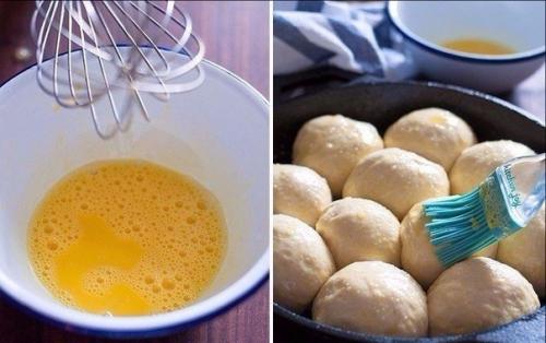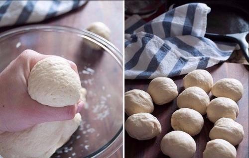 Для начала мы подготовим опару для теста. Воду подогрейте, добавьте сахар и дрожжи, оставьте на столе на несколько минут до образования шапочки. В глубокую миску просейте муку со щепоткой соли, вылейте теплое молоко и активированные дрожжи, добавьте растительное масло и замесите тесто. Положите тесто в миску, и смажьте его поверхность растительным маслом. Накройте полотенцем и оставьте в теплом месте до поднятия на 30-60 минут. Готовое тесто разделите на 12-14 шариков. Форму смажьте растительным маслом и выложите кусочки теста. Снова накройте и оставьте на 15-20 минут в теплом месте.