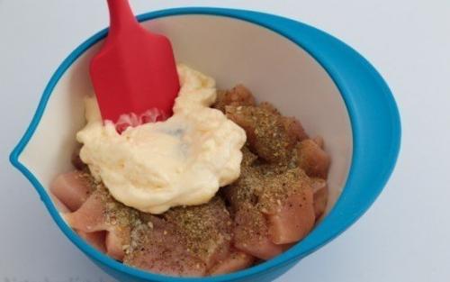 Посолите, поперчите, добавьте смесь специй и майонез.