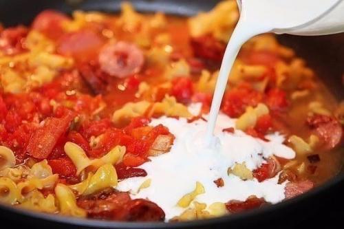 2. добавьте бульон, помидоры, сливки, макароны, соль и перец и перемешайте. Доведите до кипения, накройте сковороду и уменьшите огонь до ниже среднего. Тушите, пока макароны не станут мягкими, примерно 15 минут.
