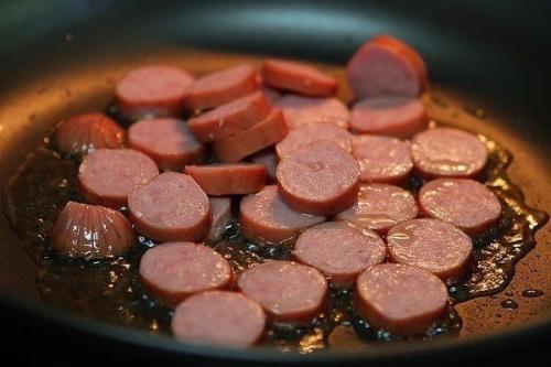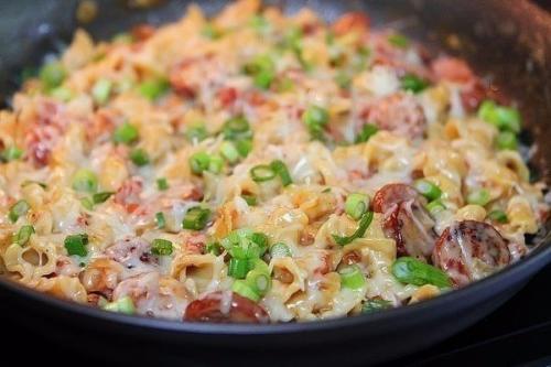 1. разогрейте оливковое масло на сковороде на среднем сильном огне, пока не появится дымок. Добавьте нарезанные колбаски и лук и готовьте, пока не подрумянится, около 4 минут. Добавьте чеснок и обжарьте еще около 30 секунд.