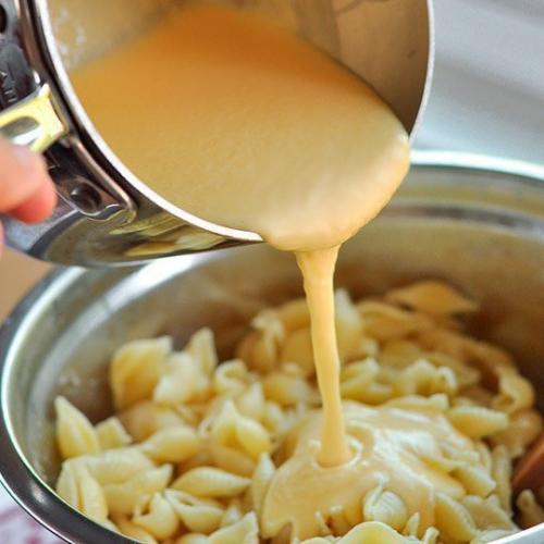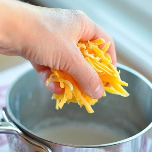 3. готовим сливочный соус для пасты: уменьшаем огонь до минимума и перемешивания добавляем горсть сыра в молоко. Затем добавьте соль и горчицу. Перемешиваем, пока весь сыр не расплавится в сливочный соус. Снимите соус с огня.