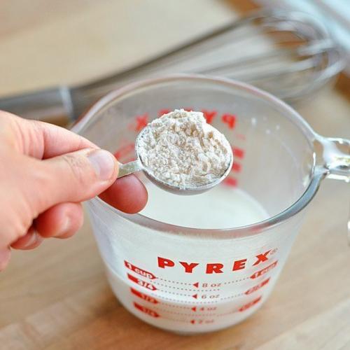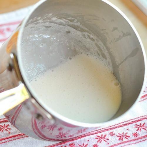 2. подогрейте молоко: после того, как паста будет готова, приступим готовить сырный соус. Вначале нагреваем 1 стакан молока в небольшой кастрюле на среднем огне. Затем взбейте вместе 1/2 стакана молока с мукой, так чтобы не было комочков. Как только от молока начнет подниматься пар, влейте в молоко молочно - мучную смесь. Продолжайте взбивать, пока молоко слегка не загустеет до консистенции густых сливок, 3-4 минут.