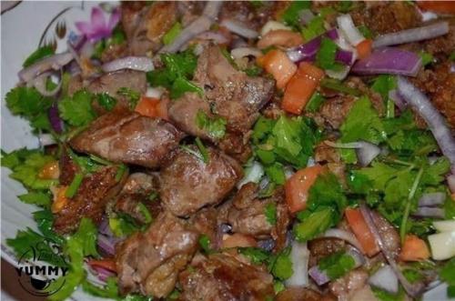 4. готовую печень выкладываем в салатник к овощам, перемешиваем.