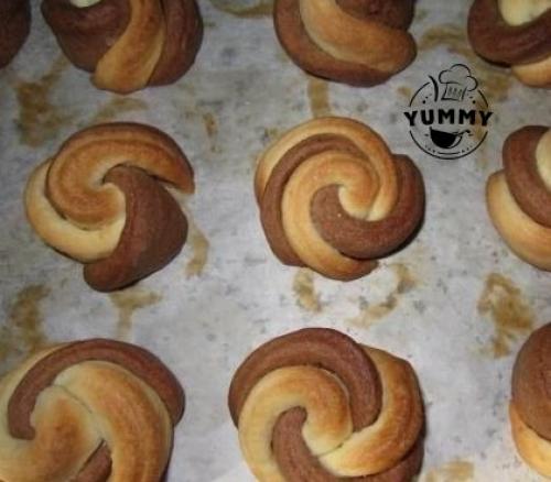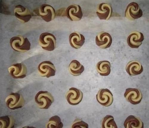1. перетереть муку с маргарином, добавить сахар, соль, сметану, муку, ванилин и разрыхлитель. Замесить мягкое, не липкое, эластичное тесто. Разделить его на две части и в одну добавить какао - порошок. Завернуть обе части теста по отдельности в пленку и отправить в холодильник на 30 минут - 1 час.