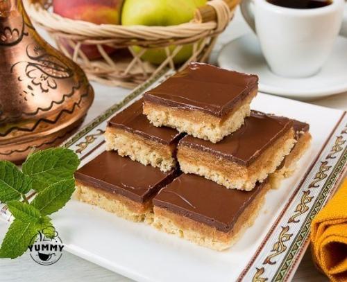 9. вливаем ганаш поверх карамели, разравниваем и отправляем в холодильник до застывания. 10. готовое печенье разрезаем на квадратики и подаем. Приятного аппетита!