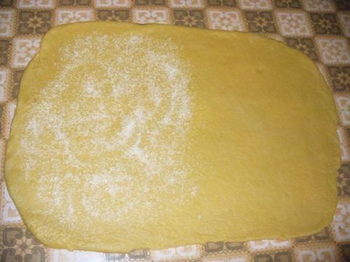 Тугое тесто замесить. Тесто в форме прямоугольника раскатать. Половину прямоугольника посыпать сахаром.