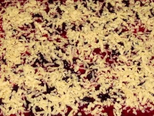 Маленький кусок теста достаём из морозилки. Таким образом, если это четверть, то трём его на тёрке и крошкой засыпаем вареньем. Внимание! Только в том случае, если там вся треть, то можно пропустить тесто через мясорубку и колбасками сверху украсить варенье. Выпекаем печенье в духовке, разогретой до 200 градусов цельсия 15-20 минут до румяной корочки.