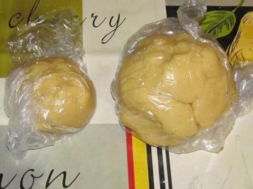 Замешиваем густое тесто. Как видно по фото, я пользуюсь миксером с чашей. При этом тесто легко руками замесить. Берём два пакета. От четвёртой части до трети всего содержимого чаши кладём в один пакет, остальное тесто в другой пакет. Оба пакета убираем в морозилку на час. В случае если будете убирать тесто на большее время, большой можно разместить просто в холодильнике.