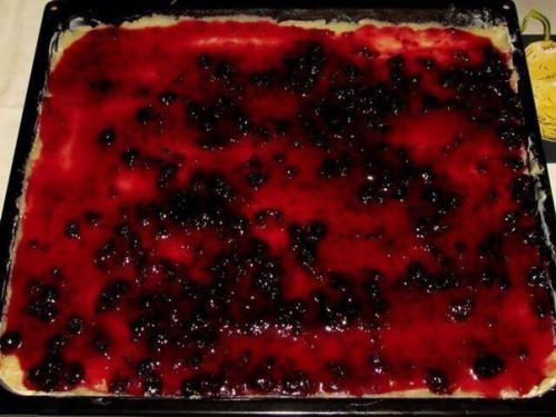 Противень для выпечки смазываем сливочным маслом. Раскатываем по нему большой кусок теста. Сверху смазываем вареньем.