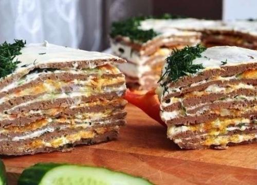 9. на сковородке 22 см у меня получилось 8 коржей. Даем им время для полного остывания. 10. Тем временем смешиваем сметану, майонез, порубленную зелень и чеснок. 11. Собираем наш тортик: сперва на корж идет сметанно - майонезный соус (~1. 5 ст. л. . 12. Затем зажаренные морковка с луком (если много растительного масла, рекомендую предварительно отжать прожаренные овощи. Потом снова корж. 13. И на соус выкладываем огурец (предварительно натереть его на крупной терке. Так чередуем начинку. 14. Получается вот такой тортик, украшаем по желанию и по наличию фантазии.