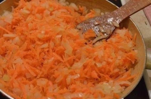 4. после чего обжариваем морковь и лук на растительном масле до слегка золотистого цвета.