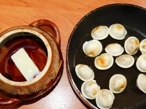 1. обжарьте пельмени на горячей сковороде. В горшочки или форму для запекания положите небольшой кусочек сливочного масла. Затем выложите обжаренные пельмени.