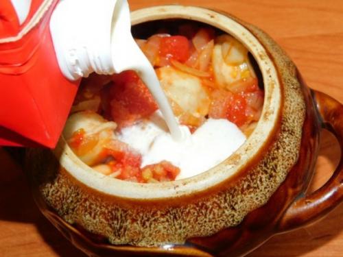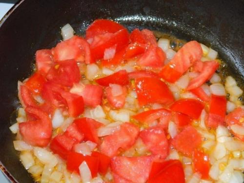 2. отдельно обжарьте лук. К нему помидоры добавьте. Обжарьте пару минут. Выложите к пельменям. Сливки.