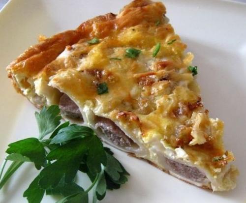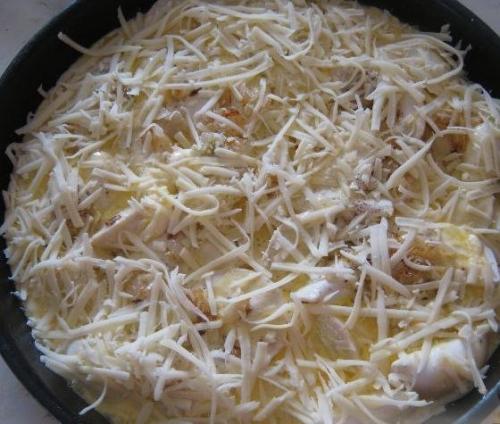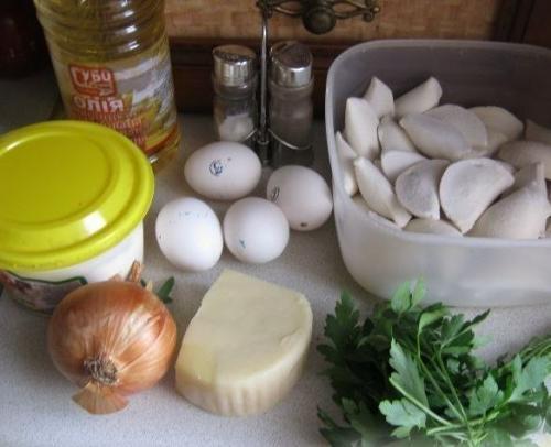 2. в подогретую в духовке форму (1-2 минуты) выложите пельмени, посолите и поперчите. Сверху выложите лук и залейте смесью из взбитых яиц с солью, перцем и майонеза.
