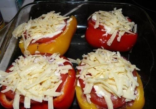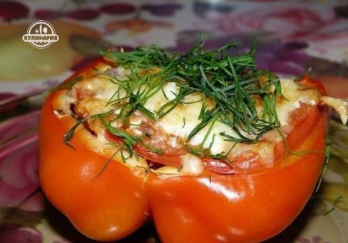 - 2 крупных болгарских перчика, - грамм 200-300 мясного фарша, - 1 помидор, - кусочек сыра для посыпки, зелень.