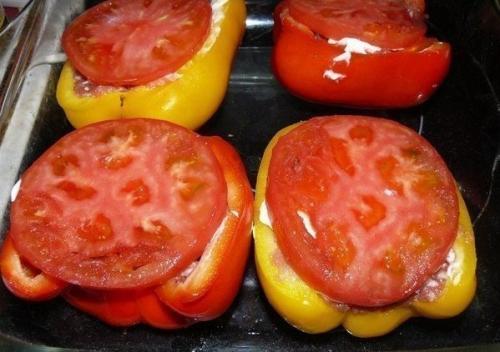 Помидор нарезаем кружочками и на каждый перчик поверх фарша выкладываем кружочек помидора.