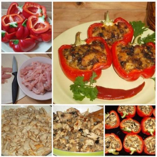 Наполнить половинки перцев приготовленной начинкой и выложить их на смазанный маслом противень. Запекать в разогретой до 200 градусов духовке в течение 30-35 минут.