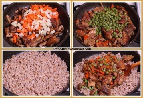 6. к перловой крупе добавить овощи и грибы. Аккуратно перемешать, подержать на огне 1-2 минуты и подавать к столу. Приятного аппетита!