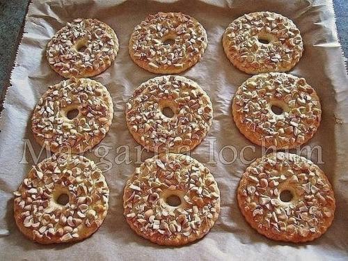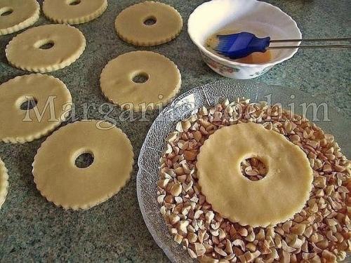 Перекладываем полученное колечко на противень, застеленный бумагой для выпечки. Орешками вверх.