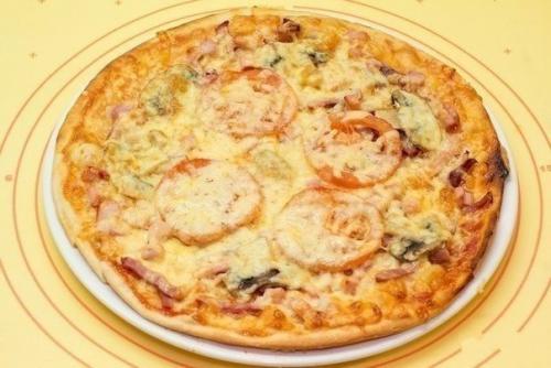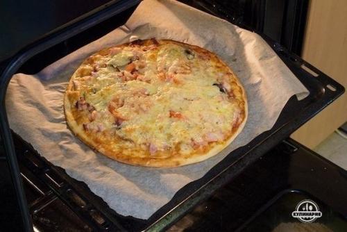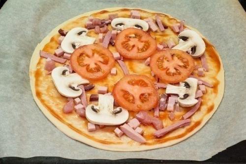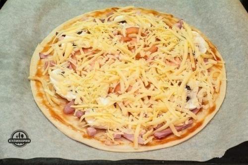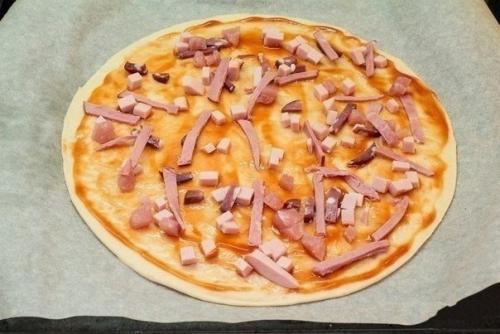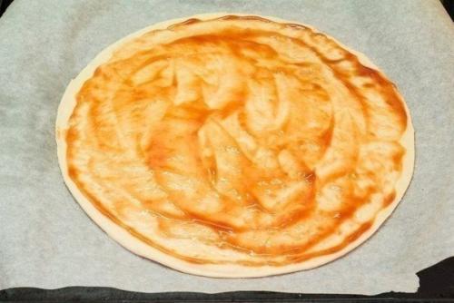 Далее необходимо нашу пиццу сдобрить томатным соусом. Когда на дворе лето, я беру спелые помидоры, очищаю их от кожуры и натираю на крупной терке. На сковороде обжариваю пару долек чеснока, добавляю к ним натертый помидор. И на достаточно сильном огне выпариваю влагу. Вот этим и смазываем пиццу. Сейчас на дворе зима, и я использую заготовку (так сказать домашний кетчуп, заготовленный летом. Далее выкладываем колбасные изделия.
