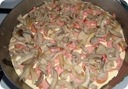 У меня сосиски, потом чуть копченой колбасы, слегка прожаренные грибы.