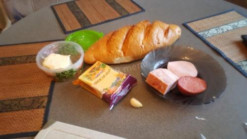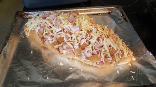 2. режем колбасу кубиками. Разрезаем батон по диагонали. Натираем сыр на крупной терке. Смешиваем сыр, масло и чеснок.