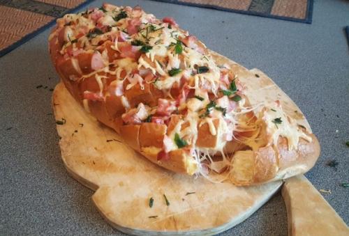 3. заполняем все прорези сначала колбасой, затем сырной массой.