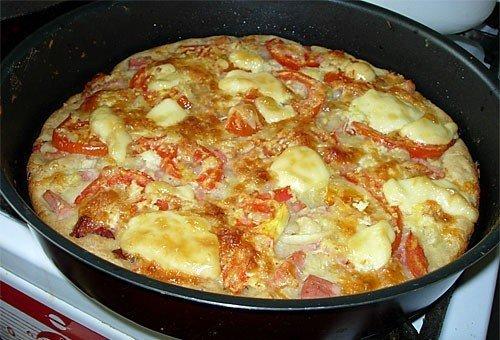 4. сыр натереть на крупной тёрке. Колбасу и лук обжарить на раст. Масле. Выложить на тесто, сверху - помидоры, посыпать сыром. Запекать 15-20 мин в духовке при 180 с приятного аппетита!