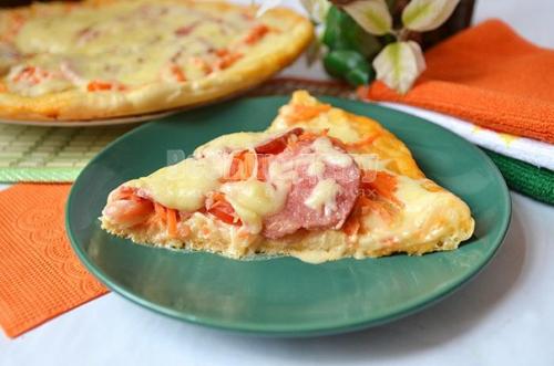 Основу для пиццы смазать равномерно кетчупом, далее выложить нарезанную ветчину, корейскую морковь и обильно посыпать натёртым сыром.