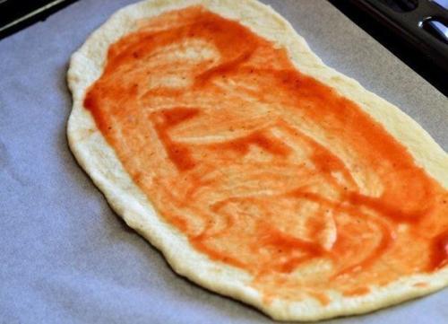 5. выкладываем подготовленные прямоугольники на противень с бумагой (2 противня), смазываем томатным соусом (по 1/2 ст. л..
