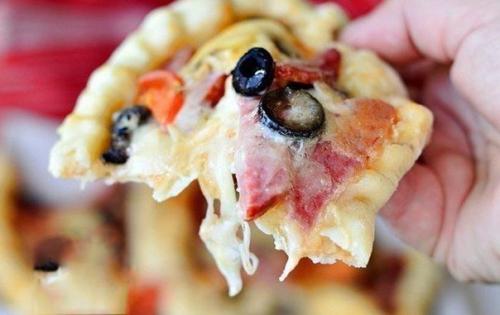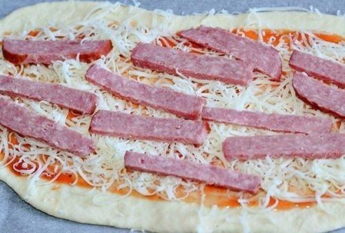 6. сыр делим на 12 частей, подготовленные салями, грибы, помидоры и оливки - на 6 частей. Выкладываем на смазанные прямоугольники части сыра и части салями.