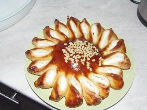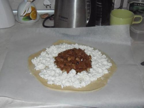 Выложить начинку (в серединке у меня была тушёная капуста, а по краям сыр 200 грамм сиртаки).